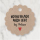 Ein personalisierter "hausgemachte Liebe"-Geschenktag mit einem Kraftsackpapier-farbenen, geschmolzenen Kreishintergrund. Machen Sie es Ihren, indem Sie Ihren eigenen Namen hinzufügen. Eine hübsche Touch für all Ihre hausgemachten Geschenke. Entworfen für Sie von BlackBerry Boulevard.