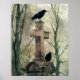 Zwei Krähen vermischen sich auf einem Kreuz, das mit grünen Moos und Flechten bedeckt ist. Ein krass grauer Hintergrund verstärkt das Foto noch weiter. Copyright © Gothicolors Alle Rechte vorbehalten.