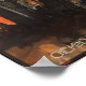 Ein altes Reiseplakat für Krakau Polen. Schöne Ölmalerei Design. Eine alte gotische Kirche mit einem Uhrturm. Im Hintergrund sind viele Stufen zu sehen. Ein auffallender, lebhafter, orangefarbener Sonnenuntergang schafft eine dunkle und geheimnisvolle Stimmung.