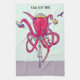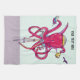 Eine lustige Cartoon-Illustration eines Oktopus, der mit dem Fahrrad fährt. Dieser Fahrradoktopus fährt wie bei einem Tourrennen auf einem Fahrrad. Der lustige Oktopus hat eine Wasserflasche und eine Glocke.