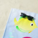 Dieser Badetuchentwurf durch die Leinwand Frog™ kennzeichnet ein Rosa, ein Türkis und eine lila Krake, gelben Fische und ein Starfish auf dem Sand im Ozean. Copyright ©2018 die Leinwand Frog™