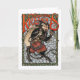 Eine Urlaubskarte mit Krampus, die eine Tasche unartiger Kinder, eine Kette und einen Peitschstock trägt.