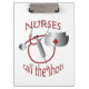 Eine grafische Krankenschwester-Design mit dem Text "Krankenschwestern nennen die Schüsse" von Künstler/Designer Charmaine Paulson auf einer Zwischenablage.