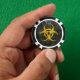 Dieses kratzte und abgenutzte Design zeichnet sich durch die Biogefährdung gefährlicher und gefährlicher biologischer Stoffe aus. Das internationale Warnsymbol besteht aus drei sich kreuzenden, offenen Kreisen mit einem vierten Kreis, der hinter dem Symbol angebracht ist. Dieses aggressive Design ist ein beliebtes Symbol, das in der Pop-Kultur mit der Zombie-Apokalypse und der Masseninfektion in Verbindung gebracht wurde.