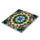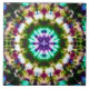 Eine psychedelische Krawatte-Färbeplatte. Die farbenfrohe Dekoration ist lila, grün, rot und blau, mit weißen und schwarzen Farbtupfern.