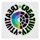 Dieses Bild zeigt ein kreisförmiges Logo mit dem Wort "CREATIVITY", das in fett gedruckten, schwarzen Buchstaben um den Rand geschrieben ist. Das Wort wird gespiegelt, wobei "KREATIVITÄT" sowohl im Uhrzeigersinn als auch gegen den Uhrzeigersinn erscheint. Im Inneren des Kreises füllt ein Schwarz-Weiß-Design, das einem Ziel oder einem Rad ähnelt, den Raum. Am links des Rades gibt es eine farbenfrohe Tortenkarte mit Segmenten in lila, blau, hellblau, grün und gelb. Zwei Sterne, ein grünes und ein schwarzes, werden oben bzw. unten im Rad platziert. Das Design legt einen Zusammenhang zwischen Kreativität und dem Power von Ideen nahe. Die kühnen, schwarzen Buchstaben und die Kontrastfarben schaffen eine visuelle Wirkung und unterstreichen die Bedeutung der Kreativität.