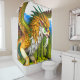 Dieser Duschvorhang hat ein Wesen darauf.