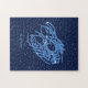 Puzzle mit dem Zodiaksymbol für Krebs in weichem silberblauem Blau, überlagert mit den Sternen der Sterne, vor einem Sternenhimmel-Hintergrund von tief Mitternacht blau bis schwarz.