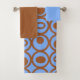 Dieses Handtuchhandtuch ist mit einem hellblauen Waschtuch, einem braunen Handtuch und einem Badehandtuch mit einer geometrischen Form von Kreisen in Reihen mit Kreise oder Ovalen in Braun auf einem blauen Set versehen.