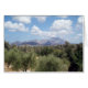 Eine landschaftliche Aussicht auf Kreta, Griechenland mit Olivenbäumen und Bergen im Hintergrund.