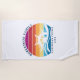 Entspannen Sie sich an Deck und genießen Sie Ihren Familienurlaub mit diesem individuell gestalteten nautischen Badetuch, das ein stilisiertes Schiffrad mit Meereswellen auf einem farbenfrohen Retro-Sonnenuntergang bietet.