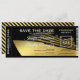Das Ticket für den Kreuzfahrten-Boarding Save the Date mit einem stilvollen, schwarzen Hintergrund, einer eleganten Silhouette mit vergoldeten Imitaten und einer extravaganten Textvorlage, die leicht zu personalisieren ist.