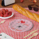 Kreuzspinne im Netz mit Tautropfen wie Perlen Pappteller