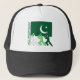Drei silhouettierten Kricketspieler vor der pakistanischen Flagge mit dem Ländernamen Pakistan auf der Seite.