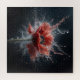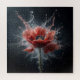 Das Bild zeigt einen Single roten Mohn in voller Blüte, Set vor einem krassen schwarzen Hintergrund. Die Blume steht im Mittelpunkt, mit ihren zarten Blütenblättern, die sich weit ausbreiten und ihr dunkles Zentrum in voller Darstellung. Der auffälligste Aspekt des Bildes ist das Wasser, das sich um den Mohn schmilzt. Es scheint, als ob die Blume im Zentrum einer Explosion steht, mit Wassertropfen, die in der Luft eingefroren sind, was einen dynamischen und fast ätherischen Effekt erzeugt. Der Kontrast zwischen dem kräftigen Rot des Mohns und dem dunklen Hintergrund sowie der scharfe Fokus auf Blume und Wasser sorgen für ein faszinierendes und künstlerisches Foto.