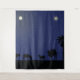 Krippe-Hintergrund oder Hintergrundtapezierung, um hinter einer Krippenaufführung mit Weihnachtsdekoration zu arbeiten, oder als Hintergrund für ein Kinderweihnachtsspiel. Die Szene zeigt Silhouetten eines Kamels und anderer Tiere gegen einen Sternenhimmel mit einer Palme.