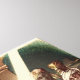 Vintage Kunst mit Malerei der Krippe mit Madonna und Kind, Joseph, drei weise Männer mit Geschenken, und Menschenmassen draußen, mit einem schönen Lichtstrahl auf den Babyjesus, der seine Hand in einem Gruß erhoben hat.