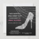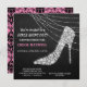 Diese elegante Junggeselinnen-Abschied-Einladung verfügt über einen silbernen Imitat Kristall oder Diamant Stilleto Ferse Schuh auf einem dramatischen schwarzen Hintergrund. Hinter dem Schuh befindet sich eine glitzernde, mehrfache Lichtfolge. Ihr eigener Text ist am links und unteren Rand in Weiß und Rosa gehalten. Die Rückseite der Einladung hat ein altmodisches schwarzes Damastmuster gegenüber passendem Rosa. Eine Kombination aus Vintagem Charme und modernem Flair!