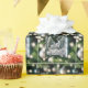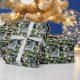 Ein viereckiger Weihnachtsschmuck hängt an einem Baum, der zwei Hirsche in einem schneebedeckten Wald mit fröhlichem Weihnachtstext darstellt