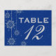 Kristallschneeflocken blauer Hochzeitskarten mit bedruckten Kristallschneeflocken und Schnee auf dem römisch-königsblauen Hintergrund. Die Tischnummer ist mit einer Postkarte versehen. Ein modernes und modernes Design für Ihren Winter Dezember oder Weihnachten Hochzeit. Dieses Retro-Template-Design ist Teil eines Hochzeitsmodells, ist vollständig anpassbar und kann personalisiert werden. Beachten Sie, dass es keine echten Kristalle, Juwelen oder Schichten gibt, sondern es sind flache gedruckte Bilder.