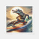 Ein Krokodil, das eine Sonnenbrille und blühende Schwimmstämme trägt, reitet geschickt mit einem Surfbrett auf einer hellen Welle unter einer großen Sonne
