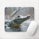 Ein Krokodil ist teilweise in eisem Wasser untergetaucht, der Schnee bedeckt seinen Schnee und die Muskeln hängen vom Mund