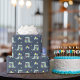 Grünes Krokodil, das auf den Hinterbeinen stehend ist und ein wunderschönes Geschenk enthält und eine Gelb- und Blauballonsaite trägt. Gelbe Sterne, Dreiecke und rote Punkte auf einem dunkelblauen Hintergrund.