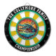 Ein visuell auffallendes kreisförmiges Krokodil-Design mit einem scharfen Ziel in einer Seenlandschaft.
