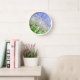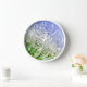 Rundwanduhr mit einem Foto aus Kronleuchtern, die mit winzigen Tautropfen und weißen Ziffern bedeckt sind.