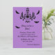 Ein Kronleuchter aus schwarzem Kristall und unheimliche Fledermäuse zieren dieses Halloween-Fest. Der Rücken ist mit einem extravaganten Spinnendamasken geschmückt. Es wird auf dem Basispapier gezeigt, aber ich empfehle das Gewicht und die Textur des Leinenpapiers. Diese Einladung passt sich perfekt dem Umschlag der Kollektion Kronleuchter und Fledermäuse an.