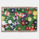 Im 19. Jahrhundert war ein Poolraum ein Pferderennwettsaal. Es wurden Billardtische installiert, sodass die Wettkämpfer Zeit zwischen Pferderennen verbringen konnten. Billards, oder Pool, ist der Nachkomme eines Spiels ähnlich dem Krokett, das im 15. Jahrhundert in Europa gespielt wurde. Obwohl wir nicht sicher sind, wird stark vermutet, dass Billard mit niederländischen und englischen Siedlern nach Amerika kam. In den 1700er Jahren arbeiteten geschickte Kabinettsmacher schöne Tische, obwohl die Ausrüstung ansonsten recht primitiv war. In den späten 1800er Jahren kam der 15-Ball-Pool auf die Bühne und wuchs in den 1940er Jahren an Beliebtheit. Billiards wurde 1961 mit der Veröffentlichung des Films THE HUSTLER wiederbelebt. Es erfreute sich eines weiteren Aufschwungs Mitte der 1980er Jahre mit der Veröffentlichung der Filmsequenz, COLOR OF MONEY. Seit dieser Zeit gibt es eine Evolution der Umgebung, in der wir Billardtische finden - sie befinden sich in Restaurants, Diskotheken und Sportbars, die es dem Pool ermöglichen, ein modernes Publikum und neue Generationen von Enthusiasten zu finden. Dieses wunderbare Design besteht aus mehreren Schichten von Billardkugeln in verschiedenen Größen für eine größere Tiefe. Sie sind in einem "grünen" Rahmen verstreut. Diese fantastische Decke ist eine ausgezeichnete Wahl für den Vatertag oder für Ihren Lieblings-Pool-Hai.