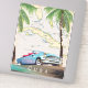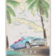 Illustrierte Karte von Kuba (mit den umliegenden Inseln) in einem Vintagen, detaillierten Stil mit einem klassischen alten Kubanauto bei Sonnenuntergang.