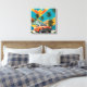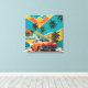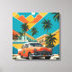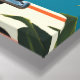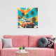 Cuba Canvas Print 2024. Ein gewagtes Design, das von der lebendigen Kultur und Ästhetik Kubas inspiriert ist. Der Hintergrund zeichnet sich durch eine lebhafte Farbpalette tropischer Farbtöne wie helles Türkis, sonniges Gelb und lebhafte Korallen aus, die die reiche Landschaft der Insel und die lebendige Atmosphäre widerspiegeln. Stilisierte Palmen und Oldtimer, symbolträchtige Symbole des kubanischen Lebens, werden in spielerischen Silhouetten dargestellt, was das Gefühl von Bewegung und Energie verstärkt. Dieses Design spiegelt den Geist Kubas wider und lädt die Zuschauer ein, seine Wärme, Lebendigkeit und seinen kulturellen Reichtum zu erleben.