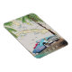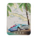 Illustrierte Karte von Kuba (mit den umliegenden Inseln) in einem Vintagen, detaillierten Stil mit einem klassischen alten Kubanauto bei Sonnenuntergang.