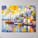 Kubistische Hafenszene mit farbenfrohen Booten, die von einem Pier angezogen werden. Abstrakte geometrische Formen und helle Reflexionen schaffen eine lebendige maritime Atmosphäre.