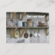 Diese Karte kennzeichnet ein Bild der verfallenen Töpfe und der Wannen auf einem Regal im Freien. Die Wörter auf der Front der Karte sagen, "benötigen Sie eine neue Küche"? Die Rückseite ist grau und kundengerecht.