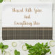 Dieses Küchentuch wird im dunklen Treibholz und im Rauche gezeigt, die mit tan Akzentstreifen kariert ist. Wörter von "segneten mit dem netten Gewürz und alles". Dargestellt auf einem weißen Tuch.