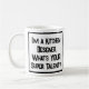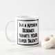 Ein lustiger Slogan auf einer Tasse, die sagt: "Ich bin Küchendesigner. Was ist DEIN super Talent?" Tasse für einen Küchendesigner. Schwarzweißtext.