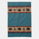 Dieses Küchentuch wird in einem niedlichen Lodge-Stil von Bären und Tannenbaum-Ikonen in schwarz-braunen Silhouetten über bräunliche und bordeauxfarbene Streifen und aquamarin-blau-grün (Libelle) Streifen Handtuch mit schwarzem Akzent Streifen gezeigt. Farbenfrohe Ergänzung Ihrer Küche oder Bar.