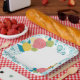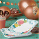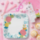 Ein hübscher Teller mit hellen Blumenmotiven und ein köstlicher Kuchen, der perfekt dazu geeignet ist, Ihrer Papierteller-Kollektion Flair hinzuzufügen.