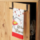 Ein Retro-Küchentuch mit individuellen Schriftzeichen und dem Lesen von "Kitchen Magician", während ein magisches Koch-Mädchen in der Küche ein wenig Zauber kocht mit funkelnd Retrobuchstaben in Schwarz, Rot und Gelb mit roten Rändern und einem schwarz-roten Retro-Sternmuster.