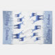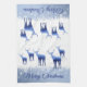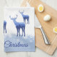 Dieses Küchentuch wird in winterblau-weiß mit einer blau-weißen Schneeflocken-Szene gezeigt. Mehrere Hirsche in blauen Tönen mit winterlichen Szenen, die auf ihren Körpern schatten, zieren beide Enden dieses Handtuches. Text von Frohe Weihnachten in tiefblauem Sapphire über weißem Hintergrund. Passen Sie dieses Objekt an oder kaufen Sie es wie geplant. Archivbild www.freepik.com