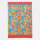 Ein Küchentuch oder ein Teetuch, mit einem fröhlichen Gesamtbild von roten, orangefarbenen und gelben Blumen auf einem hellen, türkisfarbenen Hintergrund, von Judy Adamson in einer handbemalten Papiertüte.