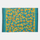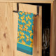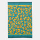 Ein Küchentuch oder ein Teetücher, mit goldenen Schmetterlingsmustern, handbemalt in Aquarell von Judy Adamson, auf aquamarinem Hintergrund.
