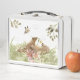 Moderner weißer LUNCH BOX Sweet Playful Watercolor Bär liegt auf einem grünen Gras in den Waldwäldern und riecht dabei eine wilde Blume.