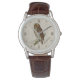 Die Natur inspiriert Armbanduhr, mit Vintager Uhuskunst auf einem Zweig, vor einem hellen Holzhintergrund. Personalisieren Sie den Namen, um Ihre Bedürfnisse Anzug. Eine tolle Geschenkidee für jeden Vogelliebhaber.