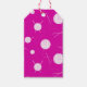Hellrosa und weiße Geschenketiketten, bedruckt mit einem Muster von Wollkugeln und Stricknadeln.