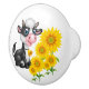Dieser Keramik-Knopf wird mit einem niedlichen Farmkuh und Sonnenblumen-Kunstdruck gezeigt. Passen Sie dieses Objekt an oder kaufen Sie, wie es ist.
