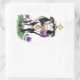 Kuh mit Glocke und Küken in einem Feld von violetten Blumen.