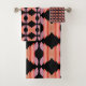 Ein Set mit Badehandtuch in fett rosa, korallenfarbenen, rostigen, orangefarbenen, modernen Mustern und schwarzer Hintergrundfarbe kann zur Koordination mit Ihrer Wohngestaltung auf jede beliebige Farbe umgeschaltet werden.